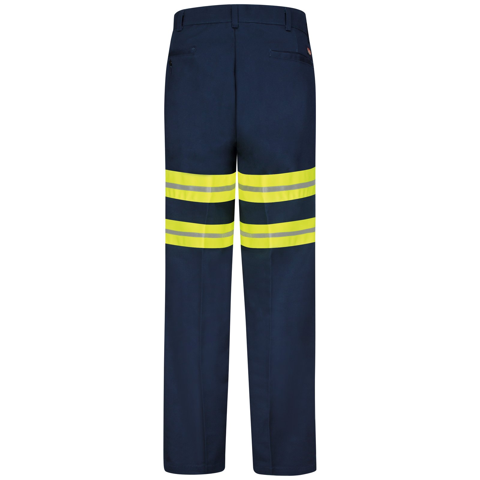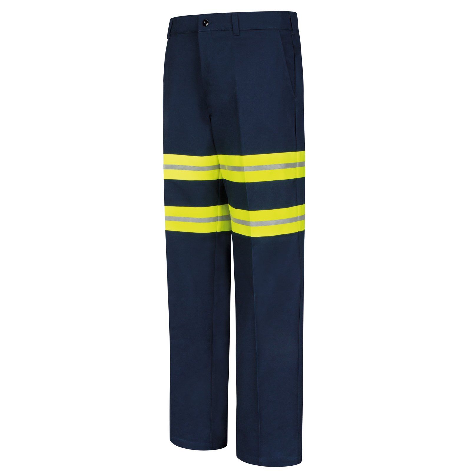 Work safely and comfortably in our 100% cotton wrinkle-resistant navy work pants with 2 ½ inch visibility strips. Made from an imported twill fabric cut in a traditional, easy fit, these trousers come with two set-in hip pockets – one that can be fastened with a button closure – and slack-style front pockets for convenience. Stay safe and mobile in this knockout pant style.