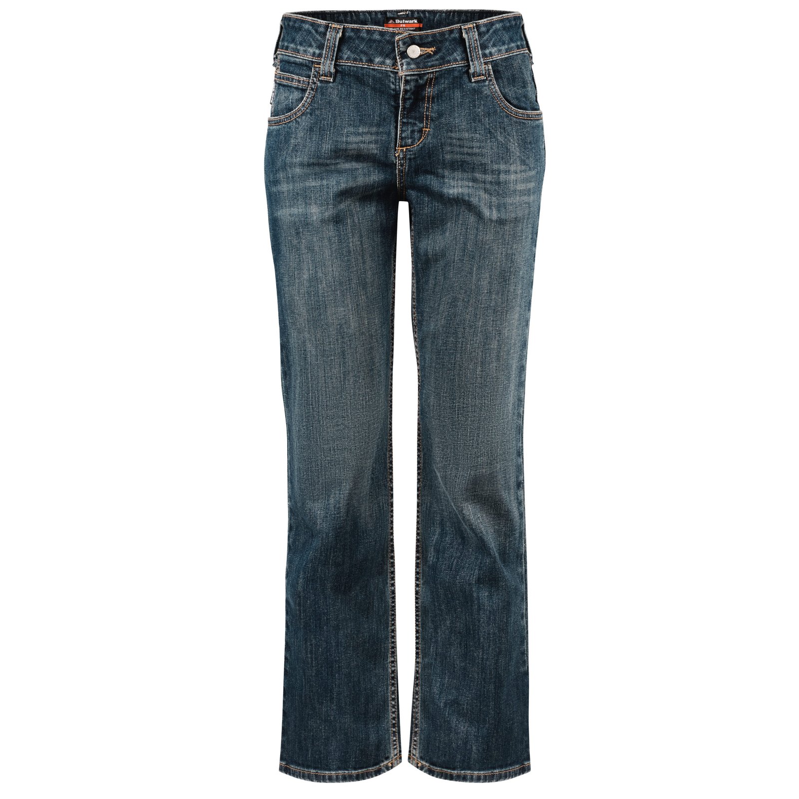 This stretch denim jean fits like your weekend jeans and moves with you while you work. Features five jean-style pockets and bootcut leg openings. These flame-resistant jeans feature a soft pre-wash and sanded fabric for a modern look, while providing CAT2 protection and NFPA® 2112 compliance. It has a one-piece waistband with metal button closure. The metal button is not exposed to your skin.